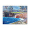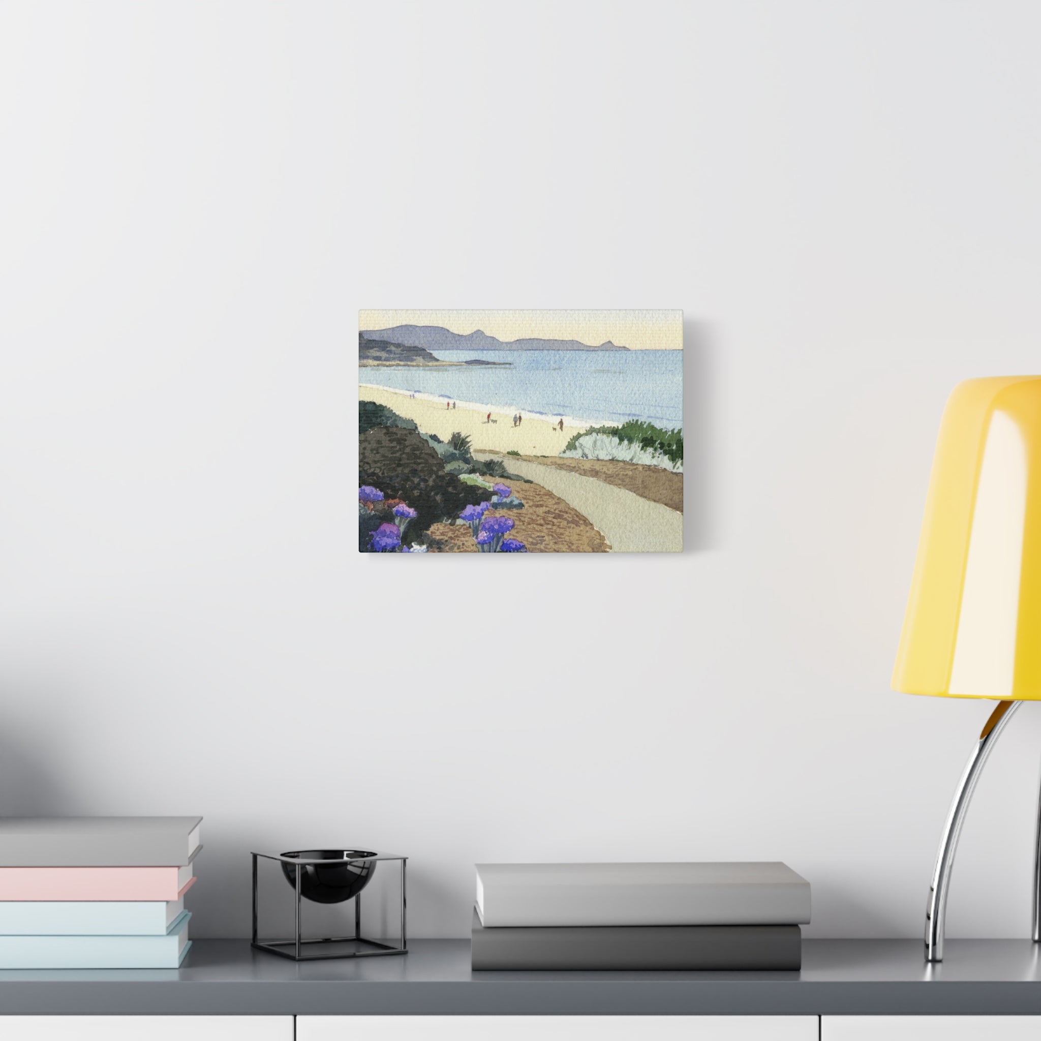 The path comes down through the ice plant and purple wildflowers and then the beach opens up wide, a few people walking dogs along the shoreline, Point Lobos sitting low and dark across the water, the Santa Lucia range behind it going soft purple in the afternoon haze. It's a view that Carmel locals walk to without thinking about it and visitors remember for years. The watercolor palette gets the light right, that particular end of day quality where the sky goes pale and the mountains deepen and the sand holds whatever warmth is left. The purple flowers in the foreground are painted with real affection, vivid enough to anchor the composition without overpowering it. The brushwork is clean and unhurried throughout, the figures on the beach small and specific, the coastal scrub rendered with enough texture to feel true to the place. The matte canvas finish suits the cool, gentle palette perfectly. Gallery-stretched on a slim 1.25" pine frame and ready to hang out of the box, it's for anyone who has come down that path to the beach and stood there for a moment longer than they planned.