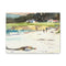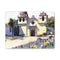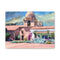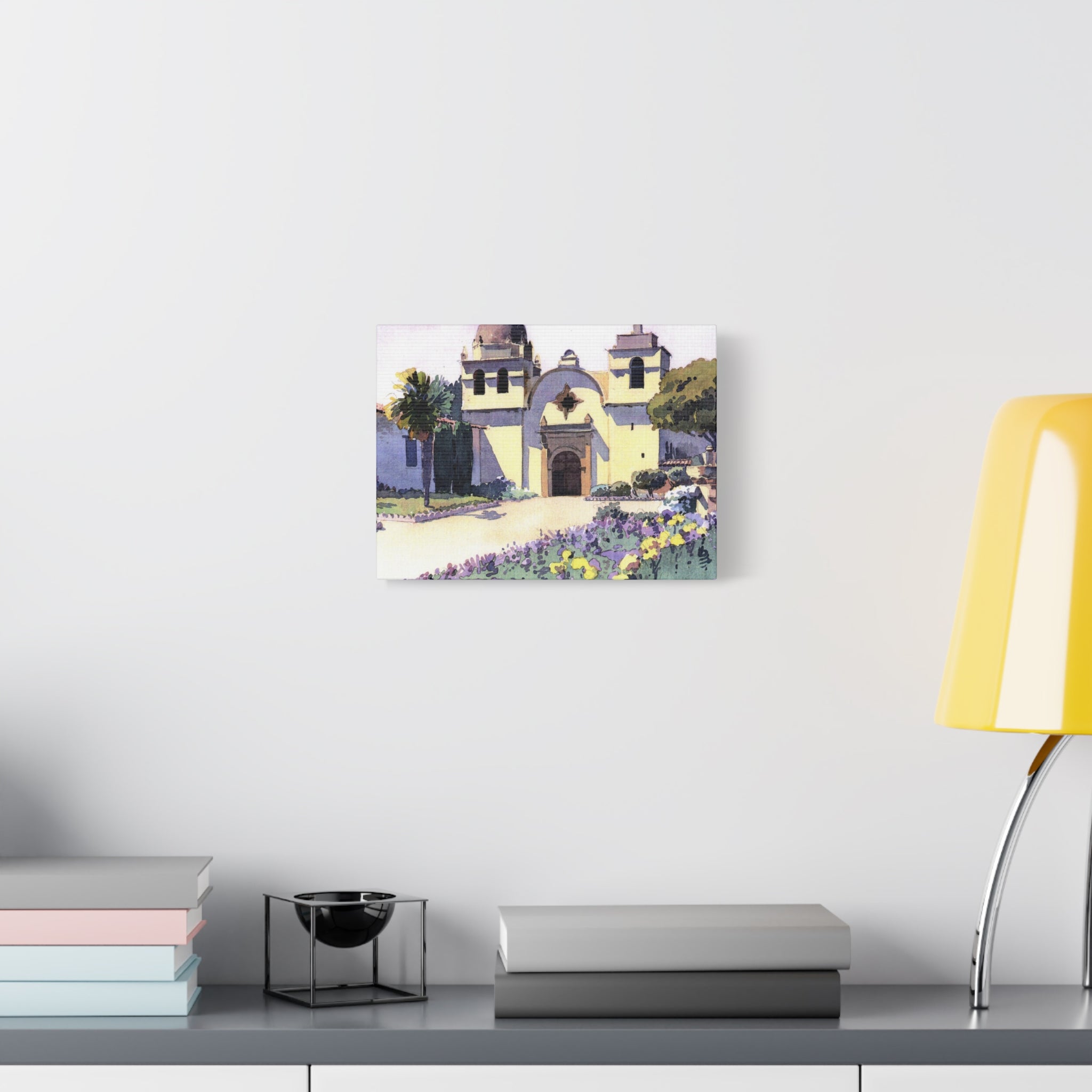 The front facade of the Carmel Mission from across the courtyard, the star window centered above the arched entrance, wildflowers going purple and yellow along the garden path in the foreground, a palm tree on the left, the whole building bathed in that flat, shadowless California light that makes the cream and lavender of the stonework look almost painted already. The watercolor treatment is clean and graphic, bold flat shapes and strong shadows that give the architecture a crispness that suits it well. The palette is warm and a little unexpected, soft yellows and cool purples in the facade, vivid greens in the garden, the flower beds along the bottom edge bright enough to anchor the whole composition. It's a painting that approaches a very familiar subject from a considered angle and finds something fresh in it. The matte canvas finish suits the bold, well-defined palette perfectly. Gallery-stretched on a slim 1.25" pine frame and ready to hang out of the box, it's for anyone who has stood in that courtyard, or anyone who wants a California mission painting with some genuine graphic confidence to it.