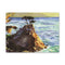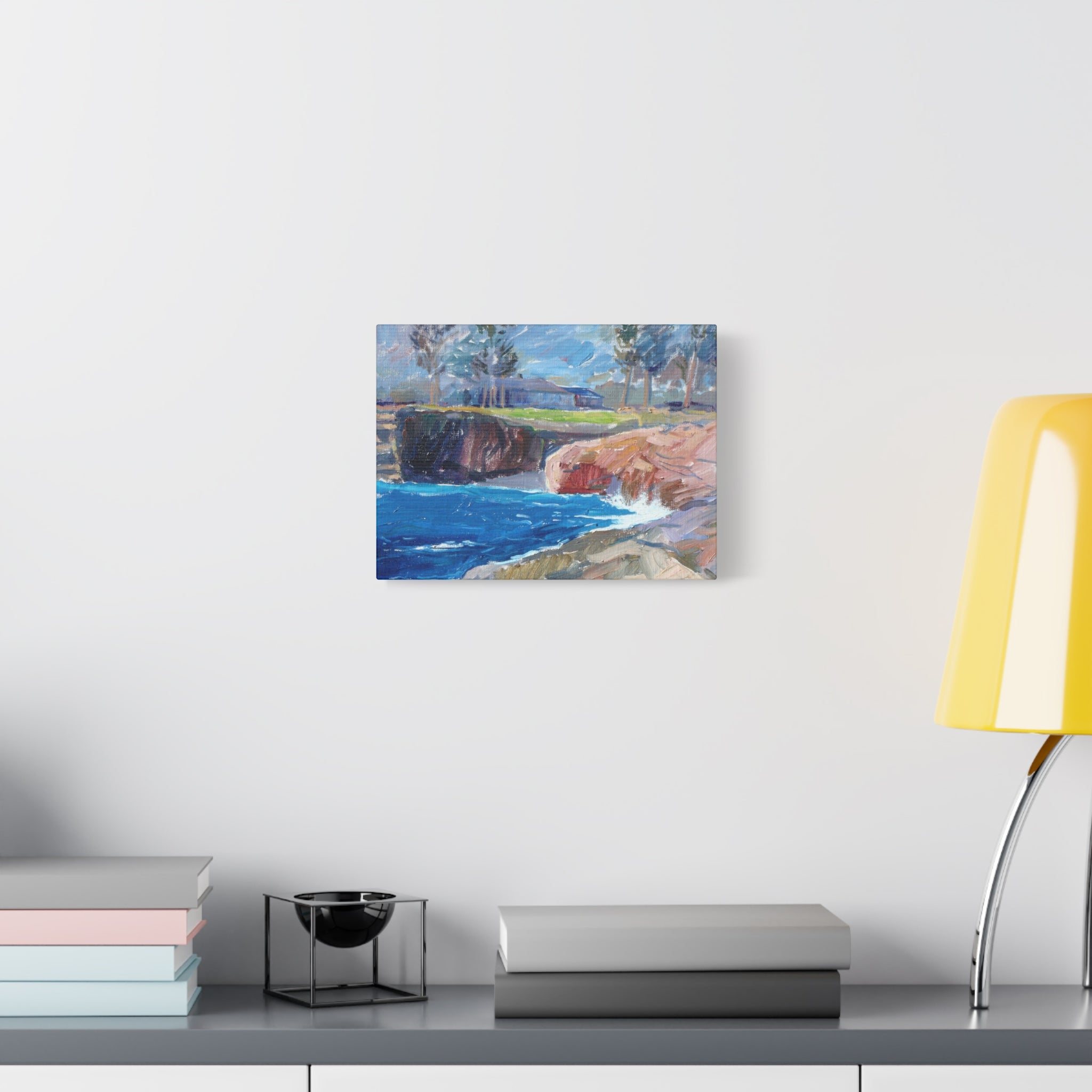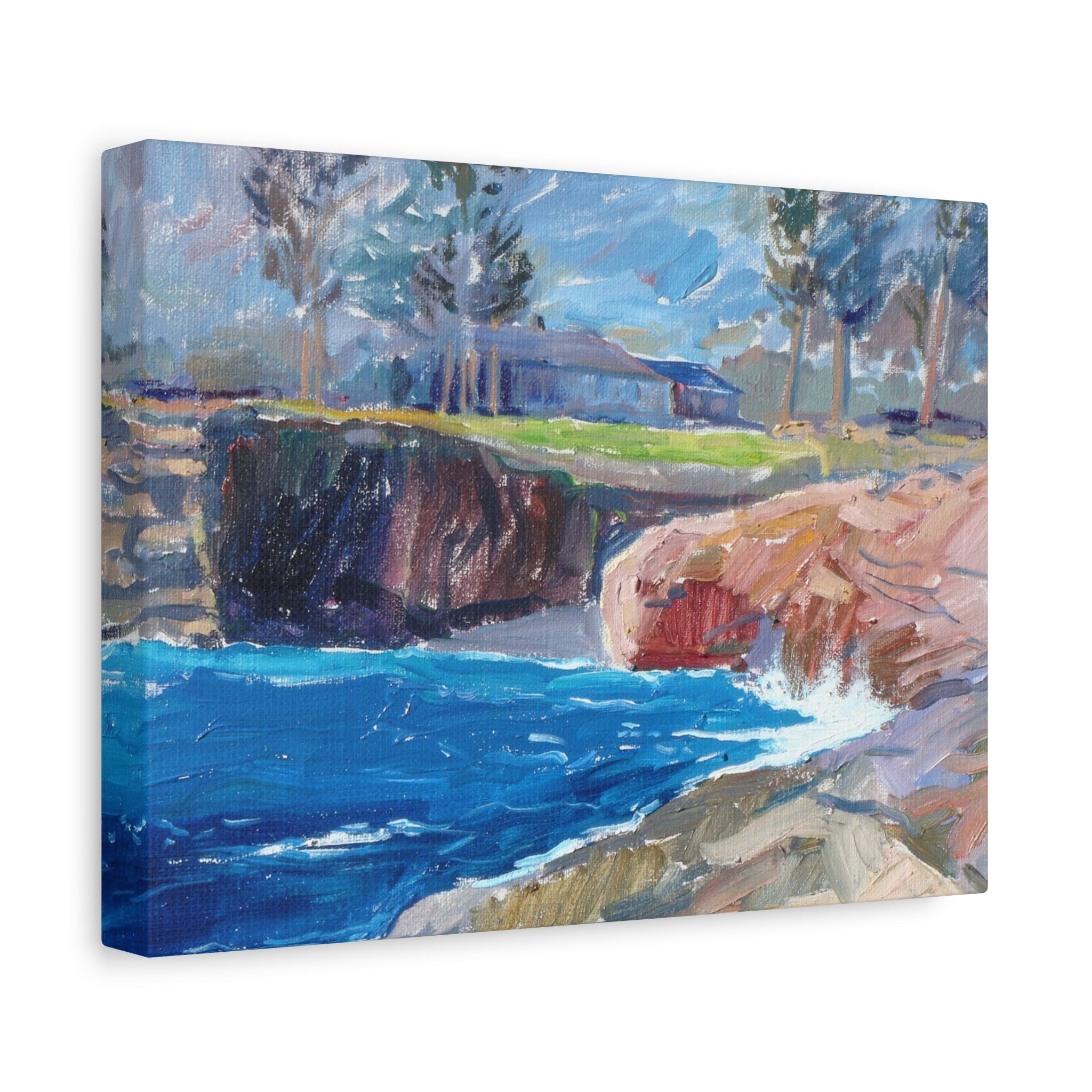 Seal Water Cove captures the energy of the coast with thick, expressive brushstrokes: cobalt water crashing against sunlit rock, a shadowed cliff, and a low bluff-top building under a sky streaked with shifting blues and grays, all printed on matte, archival-quality canvas and gallery-wrapped on a 1.25" frame that arrives ready to hang.