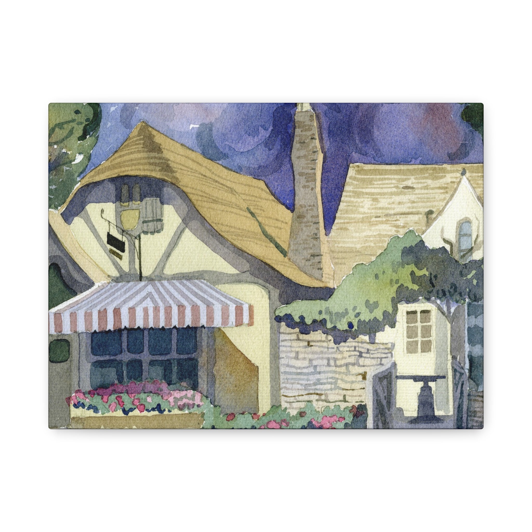 Tuck Box in Carmel looks like it was pulled straight out of a storybook, and this watercolor leans into that feeling. The sloping rooflines, striped awning, and flower boxes are all rendered in soft, layered washes, with deep blues and violets in the sky that make the warm cottage walls glow.