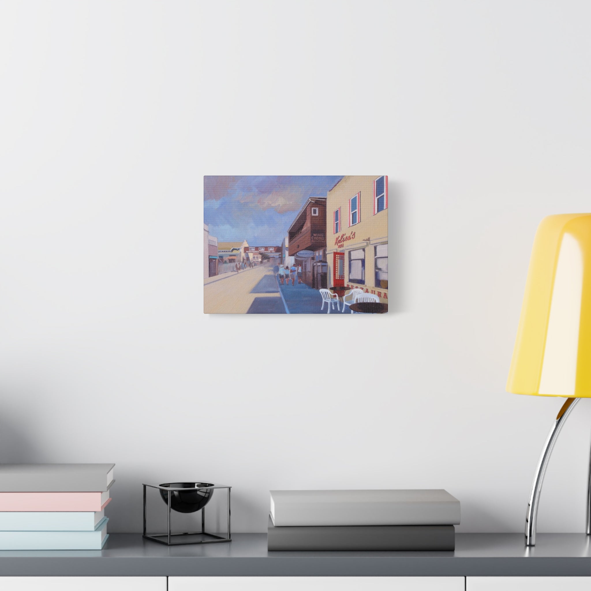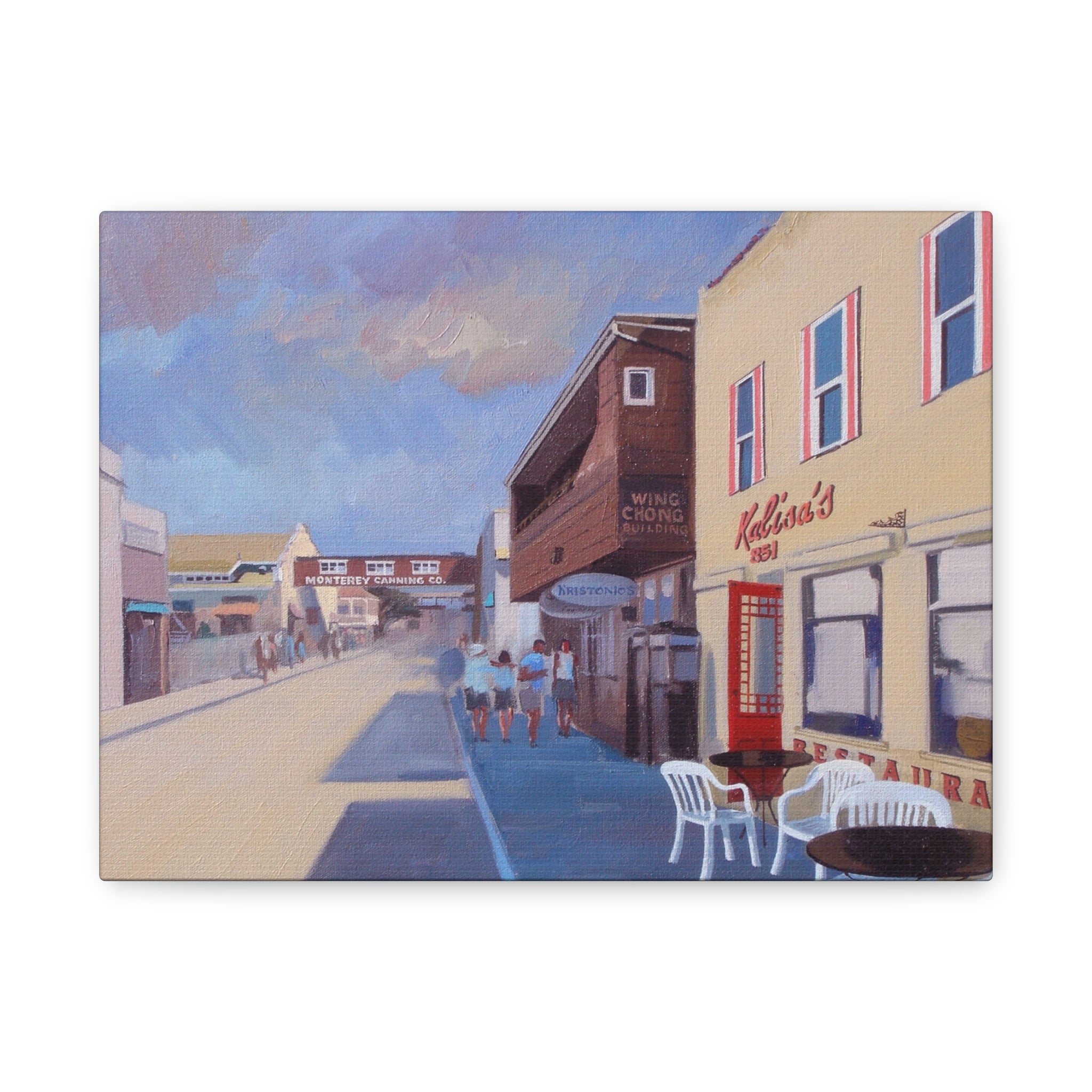 Cannery Row on a bright afternoon, the Monterey Canning Co. sign visible down the block, Kalisa's on the right, a few people making their way up the middle of the street in no particular hurry, outdoor chairs waiting for whoever sits down next. The Wing Chong Building, the old cannery facades, the whole stretch looking exactly like itself under a sky full of good blue and drifting cloud. This is an oil painting and the light in it is handled beautifully, the long shadows cutting across the pavement, the buildings catching the midday sun in warm yellows and creams. It's a painting of a street that has seen a lot of history and is currently, on this particular afternoon, just being a pleasant place to walk. The matte canvas finish suits the bright, open palette perfectly. Gallery-stretched on a slim 1.25" pine frame and ready to hang out of the box, it's for anyone who has walked that row, or anyone who appreciates a California landmark painted straight and without nostalgia getting in the way.