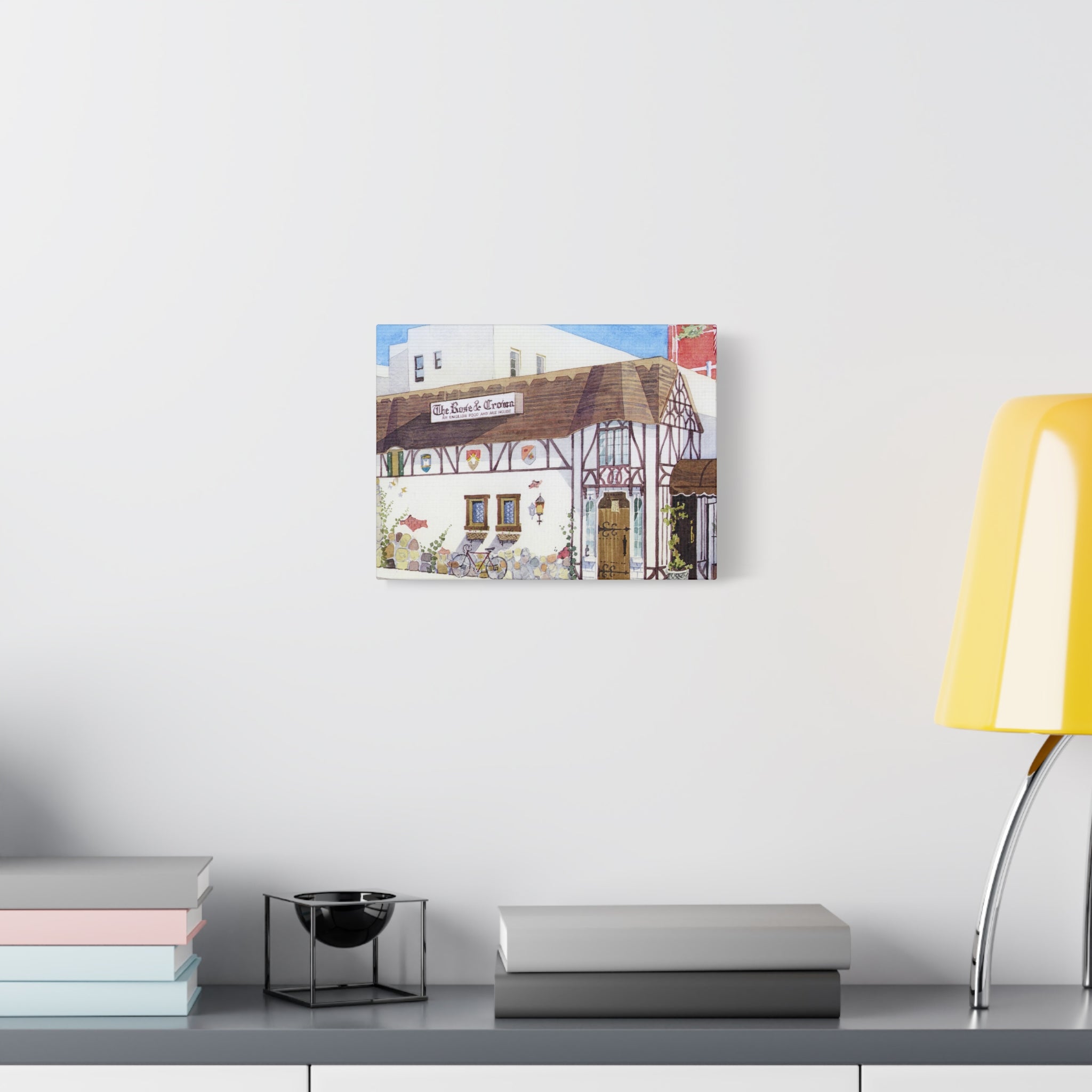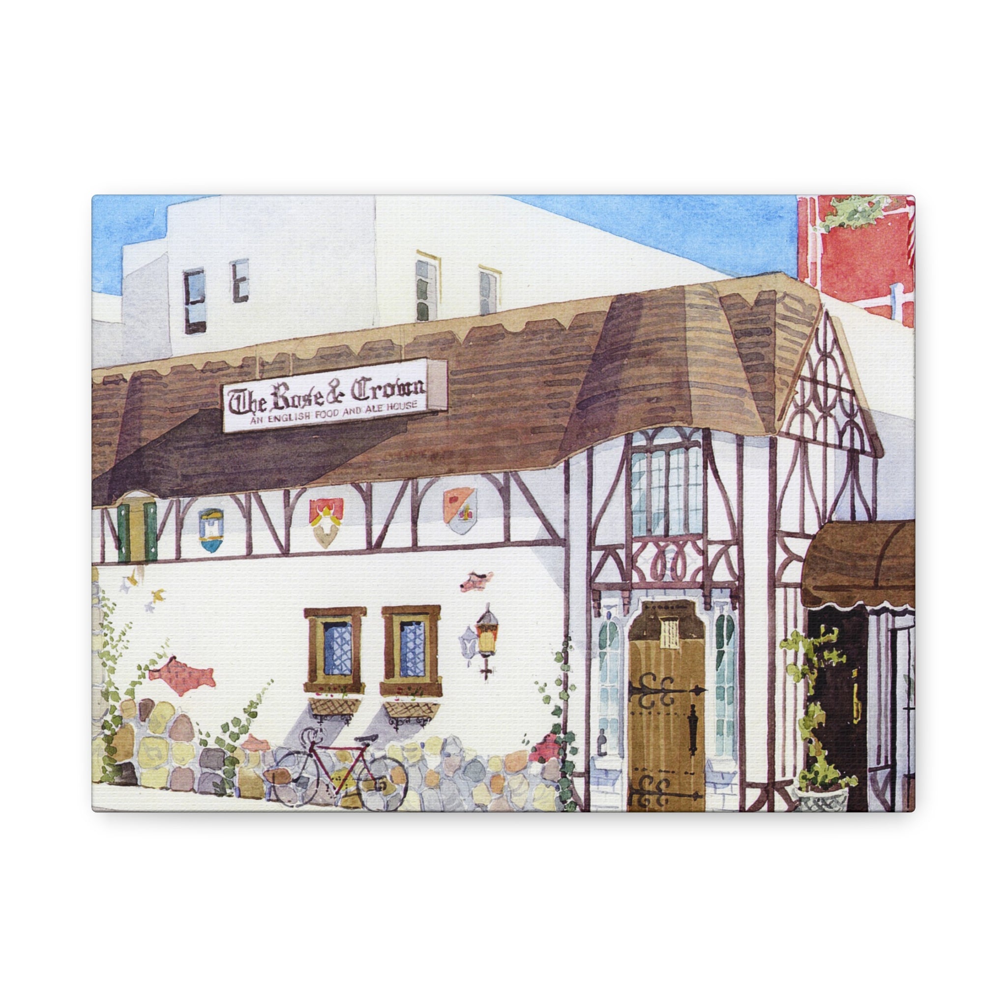 The Rose and Crown has always looked slightly out of place on University Avenue, which is exactly what makes it work. The Tudor facade, the heraldic shields, the climbing vines, a bike leaned out front like someone just popped in for a quick one. This watercolor canvas print leans into all of it, the half-timbered exterior painted in clean whites and warm browns, the little stained glass windows, the hand-lettered sign declaring it an English Food and Ale House with complete sincerity. It's a cheerful painting of a cheerful building and neither is trying too hard. The brushwork is tidy and affectionate, the kind you get when the subject genuinely deserves it. The matte canvas finish keeps everything crisp without feeling rigid. Gallery-stretched on a slim 1.25" pine frame and ready to hang out of the box, it's for anyone with a soft spot for the Rose and Crown, for Palo Alto, or for a pub that has committed fully to its bit and never wavered.