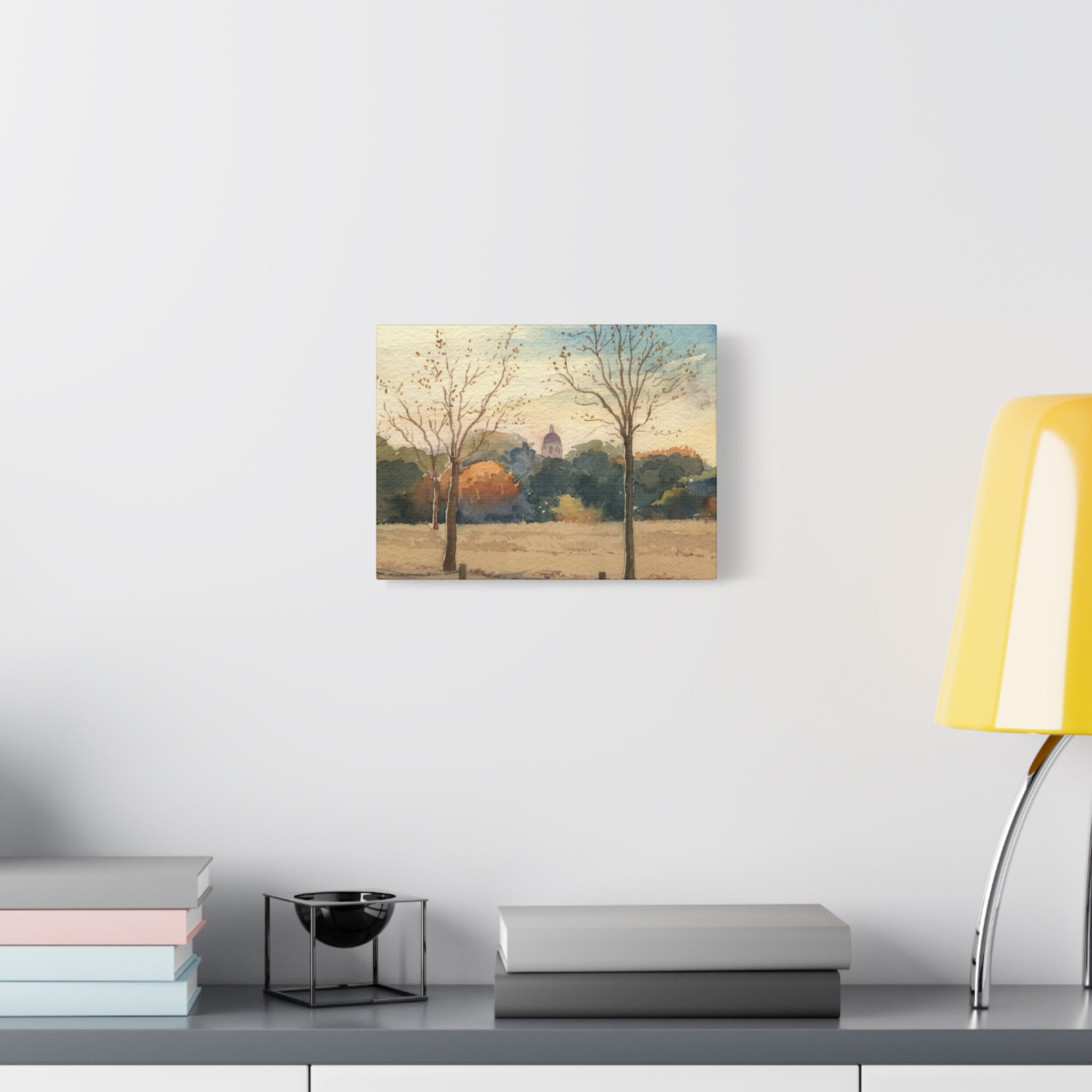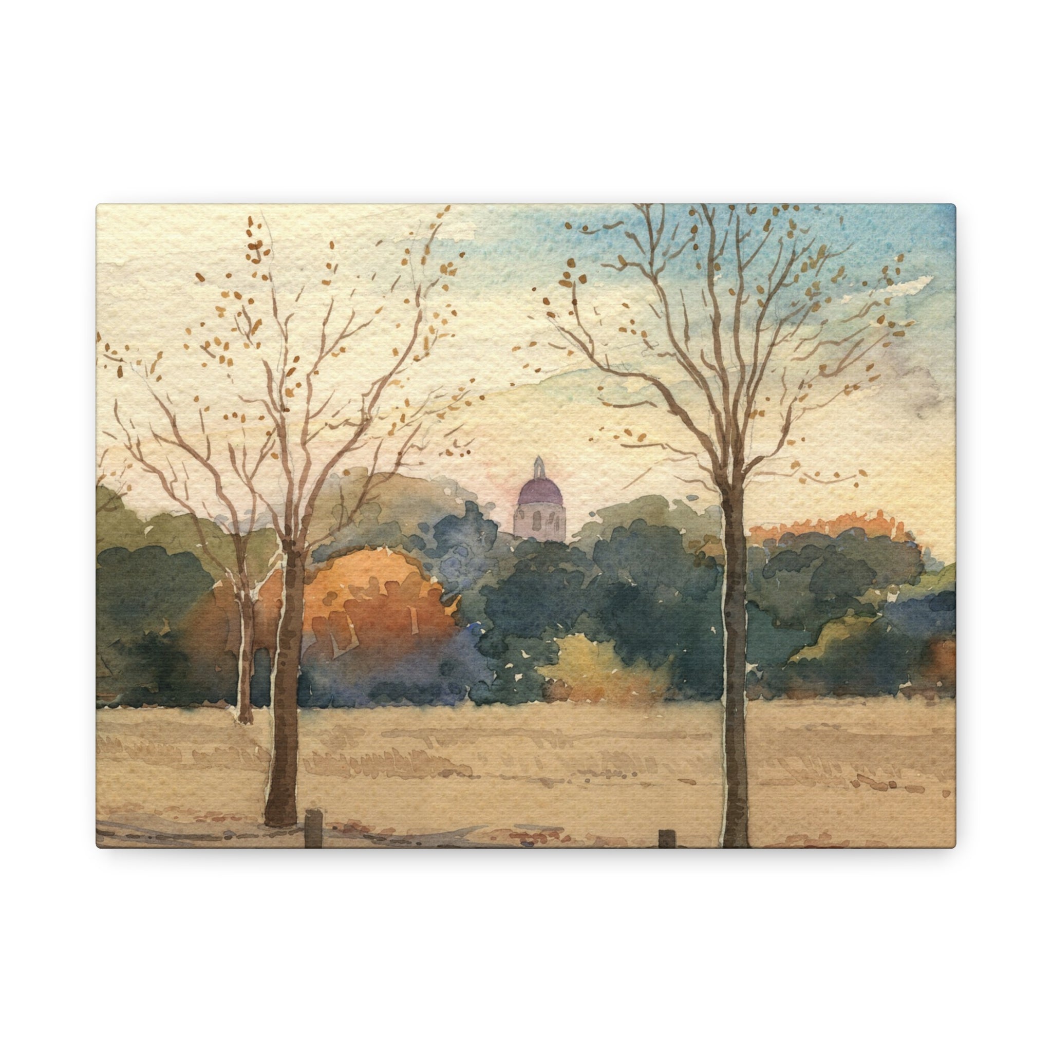 The Stanford dome doesn't announce itself here. It sits back behind the treeline, just visible through the bare autumn branches, the way you might catch it cutting across the Oval on a late afternoon in November when the light has gone warm and the campus has finally quieted down. This watercolor canvas print gets that mood exactly right, soft golds and deep greens and a sky that can't quite decide between blue and dusk, the whole scene feeling like the end of something good. The brushwork is gentle and a little sparse, which suits the season perfectly. The matte canvas finish gives it a quiet, papery quality that feels right for a painting this unhurried. Gallery-stretched on a slim 1.25" pine frame and ready to hang out of the box, it's for anyone who spent time on that campus and remembers what fall felt like there, or anyone who simply appreciates a landscape that knows when to hold back.